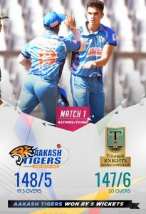 Chasing 148, Aakash Tigers were off to a solid start with openers A Gomel (34) and Kaustub Pawar (41) putting up 67 runs for the 1st wicket. The rest of the batsman chipped in with starts as Aakash Tigers crossed the victory line in 19.3 overs winning the match by 5 wkts.