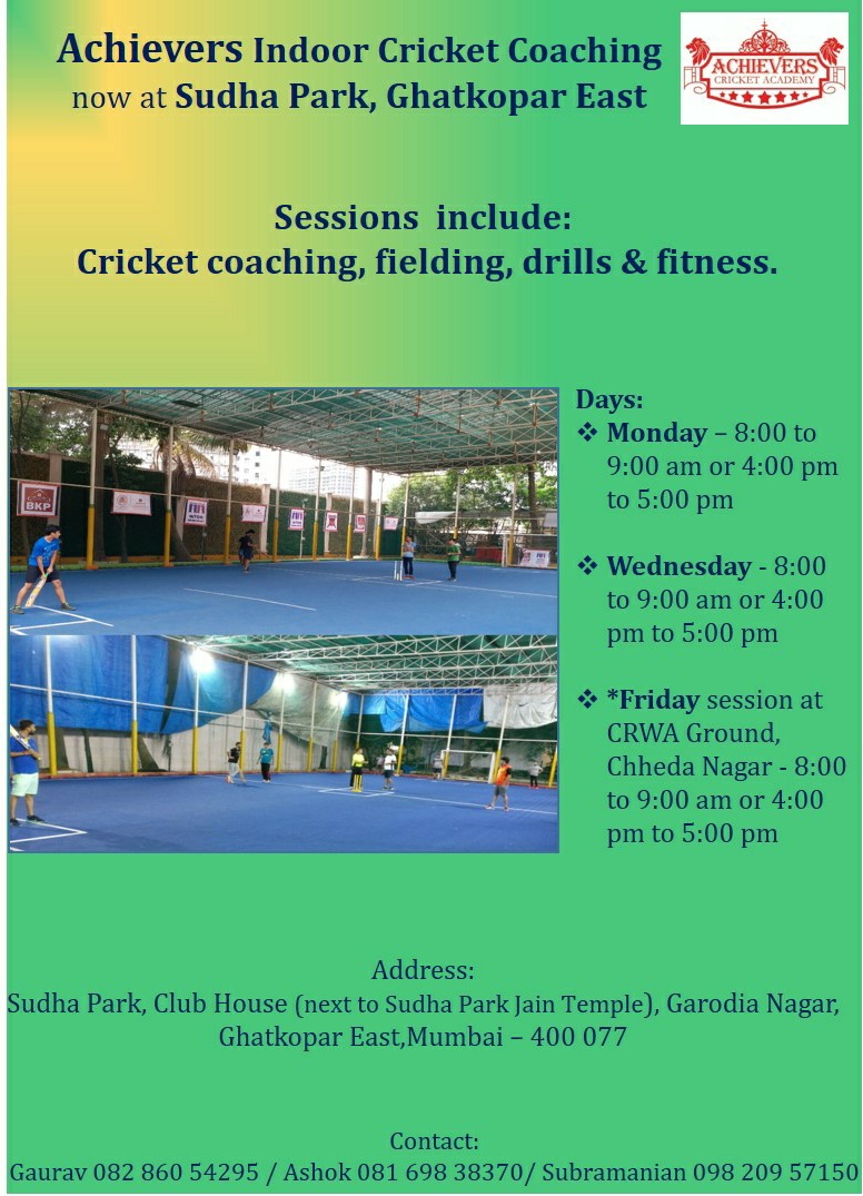 Achievers Cricket Academy presents Monsoon Indoor Coaching Now at Ghatkopar East. It has Session Include : Cricket Coaching, Fielding, Drills and Fitness.