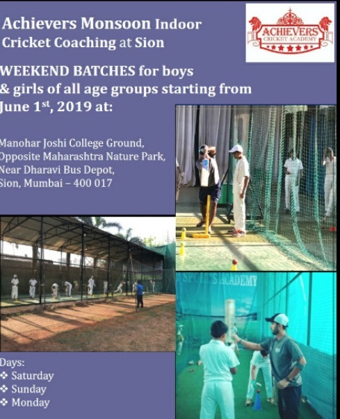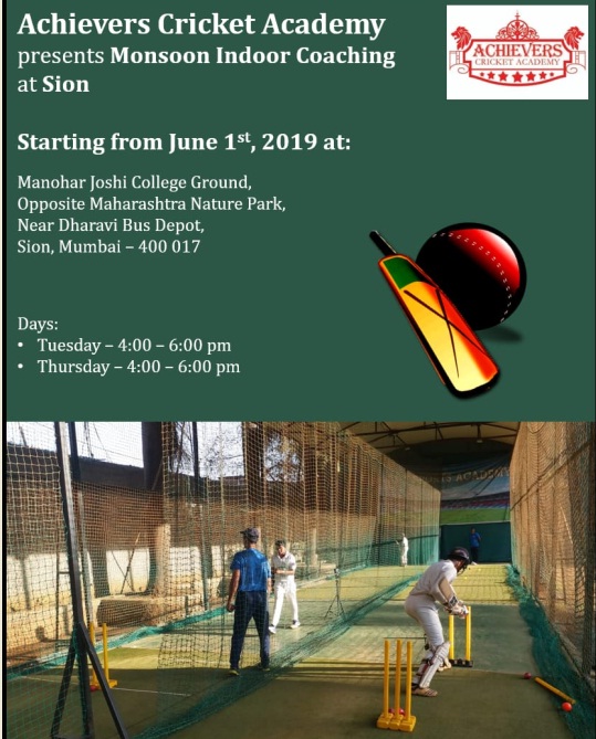 Achievers Cricket Academy presents Monsoon Indoor Coaching at Sion. Starting from June 1st 2019 at Manohar Joshi College Ground Opp Maharashtra Nature Park Near Dharavi Bus Depot Sion Mumbai