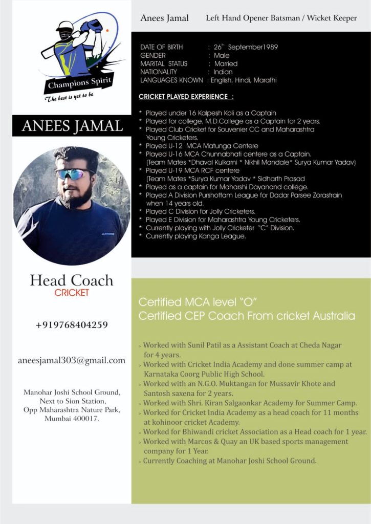 Head Coach – Cricket Academy Of Jamal Tilak Nagar