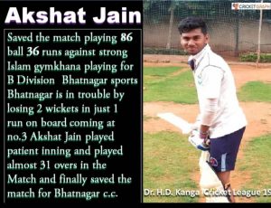 Bhatnagar Sports CF in reply were in deep trouble at one stage when they were 2/5 in the 1st 3 overs. However, Akshat Jain played a fighting knock of 36* in 86 balls (7fours) batting unbeaten till 31 overs. It was his fightback which resulted in a draw against the powerful Islam Gymkhana side.
