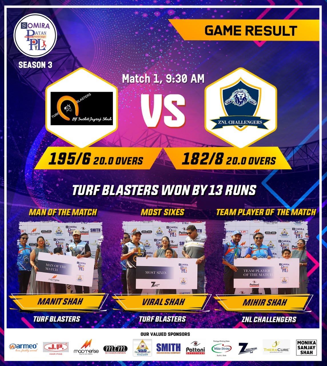 Chasing 139 looked like a mere formality for Turf Blasters as they chased down the total in 19.3 overs winning the match by 7 wkts. Viral Shah (28) & Manit Shah (28) were the top scorers for their side while the rest of the batters also chipped in with cameos.