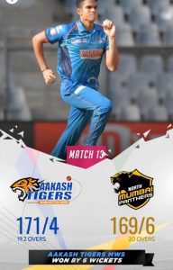 What’s more Mulani ended the game in style hitting veteran Pravin Tambe for a six and a boundary as Aakash Tigers won the match by 6 wkts and 4 balls to spare.