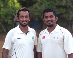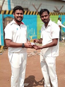 After choosing to bat first, KRP XI were struggling at one point on 52/5 but it was Harshal with a handy 37 at no.7 and Sandeep Naik at no.9 who scored a match winning 58* off 78balls(5fours, 1six) rescuing KRP XI from nowhere and helping their team reach a respectable 189/9 in 45overs. Sandeep’s half century was literally match saving as KRP XI defended their total successfully by restricting Taki Team SC to just 120all out in 35.4 overs on the back of terrific bowling by Vishal Kavaiya (4/11) and Musheer Khan(3/23). Sandeep Naik made it an all round show just like his brother Rakesh bagging two wickets too as KRP XI won the match by 69runs.
