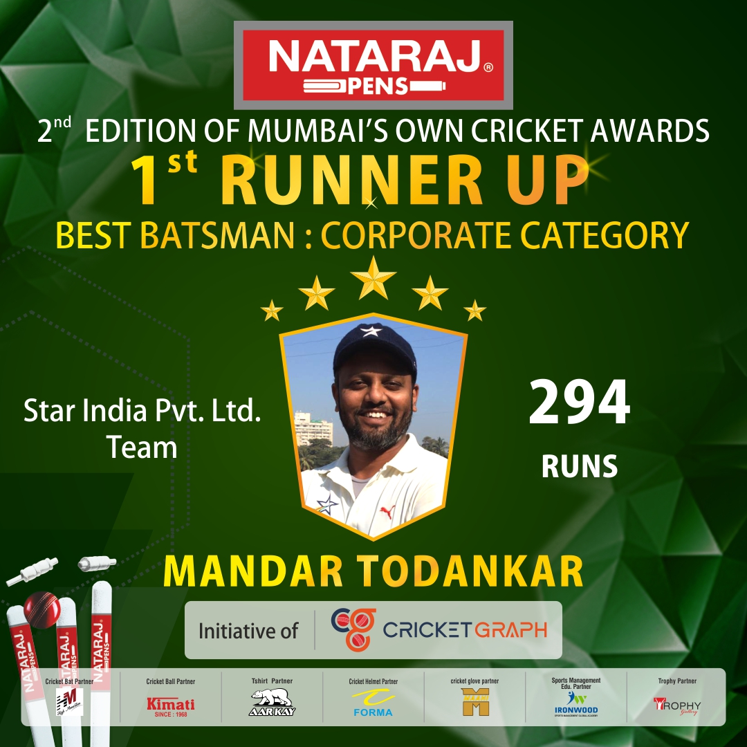 Mandar known for his aggressive batting scored 294 runs in 7 innings with a best score of 100 which came in mere 47 balls in the Masters Cup making him a very dangerous batsman in the T20 format.