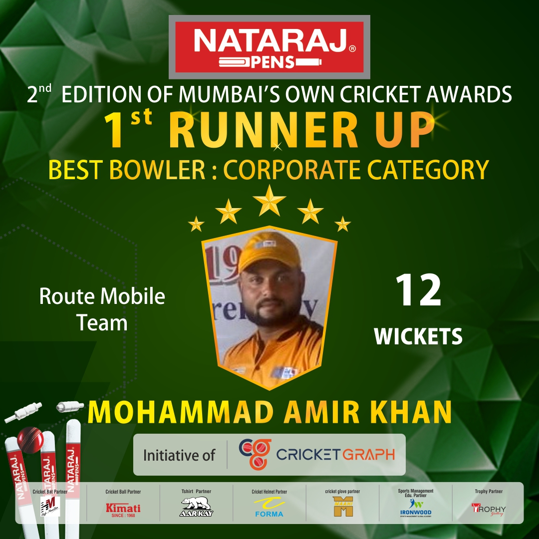 With 12 wkts in 5 innings, Mohamad Amir was tough contender for the winner’s spot but he eventually became the 1st runner up. He has been the frontline bowler for Route Mobile and has bowled some impressive spells this season.