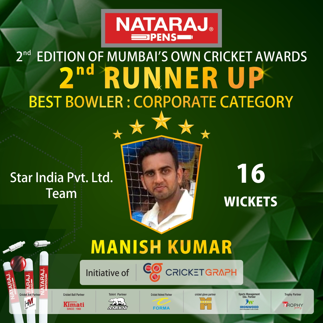 Manish Kumar has bagged 16 wkts in 9 innings for Star TV this season making him a more than reliable bowler. He has delivered consistently for his team and struck wickets whenever the team required breakthroughs.