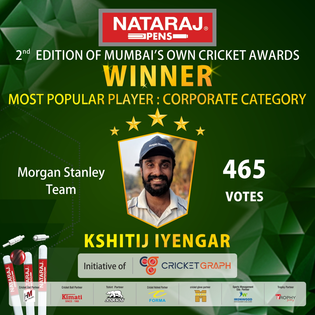 With 465 votes to his name, Kshitij not only became the most popular player in the Corporate Category but he is also the Mr. Consistent. Khsitij has smashed some quick half centuries as well as some brilliant hundreds for Morgan Stanley and he is certainly one of the batting mainstays of his team. His 54 ball 100* vs MTM Ship Management in the Dreamz Corporate Trophy still remains fresh to many of the opponents in the corporate category.
