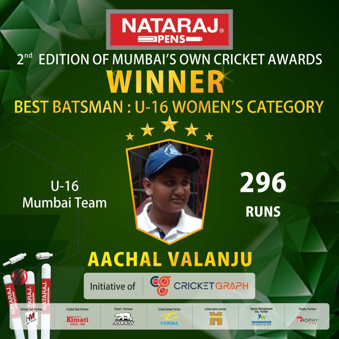 Aachal Valanju from Mumbai U16 Team – Winner of U16 Category, Best Batswoman