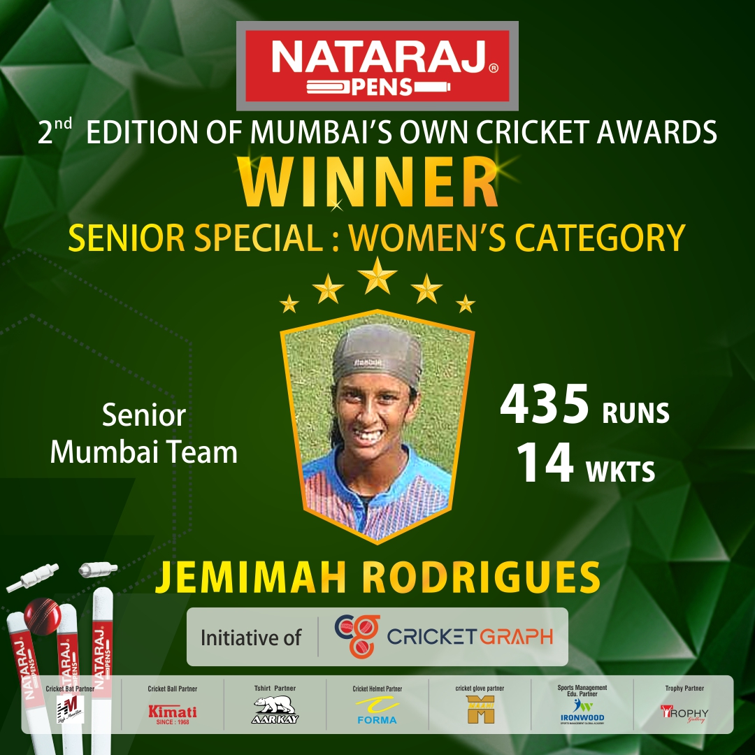 Jemimah Rodrigues from Mumbai Senior and Indian Cricket Team- Special Cricket Award, Winner of Best Batswoman, Senior Category
