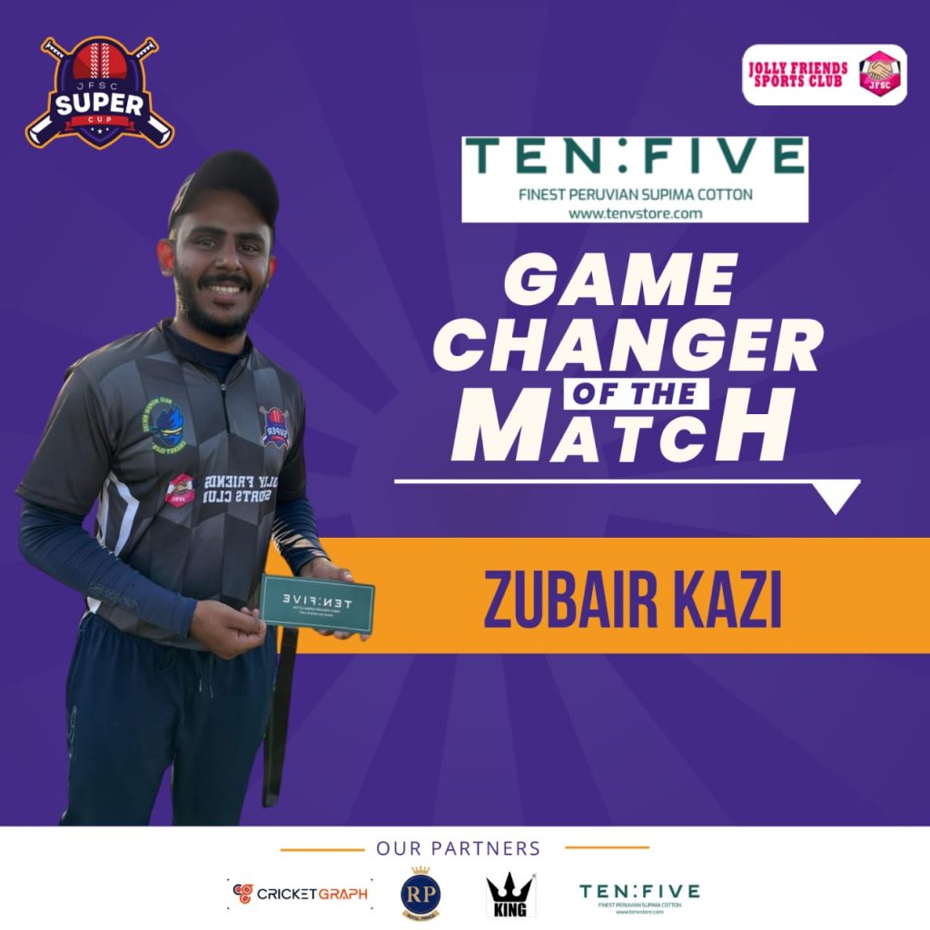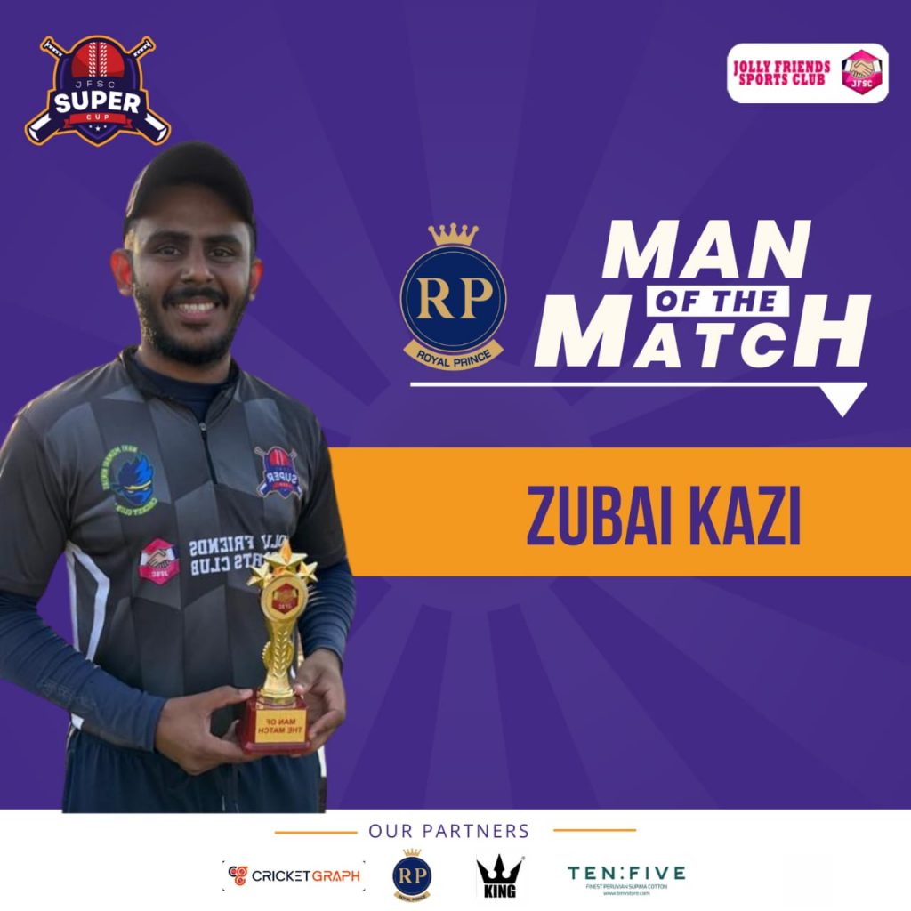 The Silver Finals of the JFSC Super Cup was a run-fest between the Navi Mumbai Ninjas and Antique Friends with 404 runs scored in the match. Batting first, the Ninjas mounted a total of 207/8 in 20 overs. Abhijeet Rohandiya anchored the innings as he faced 46 balls and scored 68 with 8 fours and 2 sixes to his name. As he built his innings, he also formed small but crucial partnerships with Azan khan and Yash Doshi, setting up the final overs for Zubair Kazi. Kazi only faced 14 deliveries but caused huge damage as he hammered 53 at a strike rate of 378. Out of the 14 balls, 8 of them were hit for a boundary and just one of them was a four. His innings was the difference maker between the two sides.