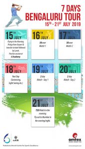 On day 1 there will be a practice session at the “6 Academy” followed by two 50 over matches on Day 2 and Day 3. The 4th day will be saved for sightseeing, swimming sessions and practice while a 2 day Test match will be conducted on the 5th and the 6th day.
