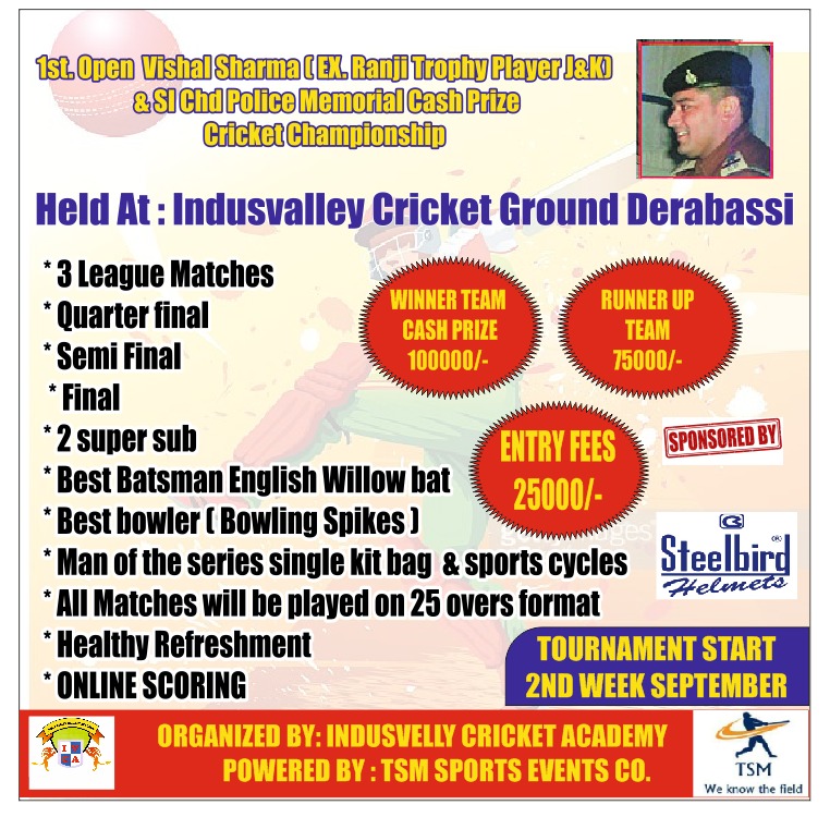 Indusvelly Cricket Academy Organized and Powered By TSM Sports Events Co. 1st Open Vishal Sharma (Ex. Ranji Trophy Player J&K) & SI Chd Police Memorial Cash Prize Cricket Championship . Starting From 2nd Week of September 2021. in Delhi / Mumbai/ Pune/ MP & Gujrat.