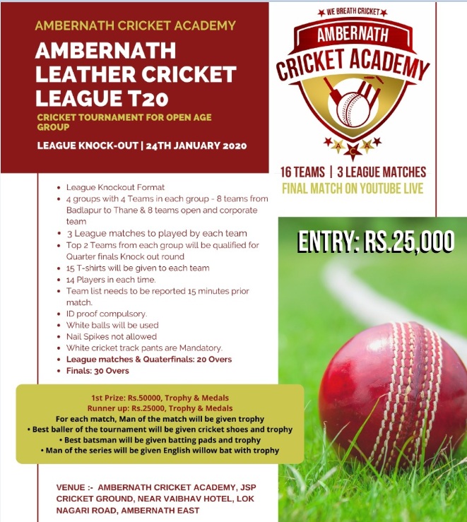 Ambernath Cricket Academy Organized Ambernath Leather T 20 Cricket League 2020 For Open Age Group League cup Knock Out Starting From 24th January 2020. With Following Facilities.
