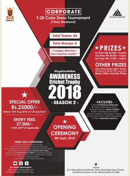 KJEI Presents and are Happy to Invite you for “Awareness Corporate Trophy 2018 Season 2 which is “Trinity Cricket Cup 2018” Trinity Sports Complex, Kondhwa Annex.