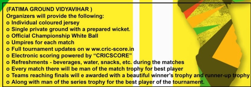 Tournament 1Rs.60,000/- Entry Fees For Per Team ( Fatima Ground Vidyavihar) Solo Ground | ₹60000 | Book Now |