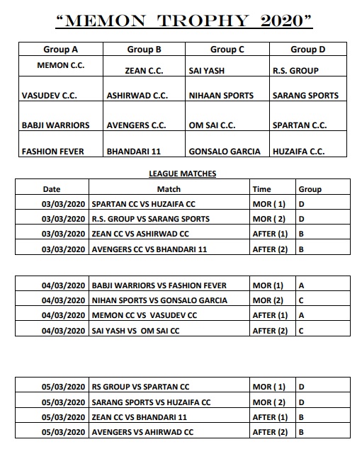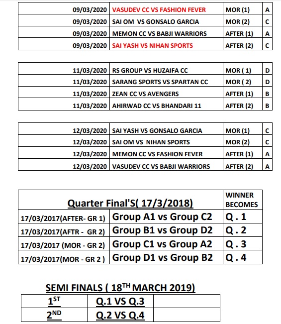 • FOUR GROUPS EACH CONSISTING OF FOUR TEAMS WILL BE PREPARED . • EACH TEAM HAS TO COMPULSORILY PLAY THREE LEAGUE MATCHES. • TWO TEAMS FROM EACH GROUP WILL QUALIFY FOR THE QUARTERFINALS BASED ON THEIR POINTS AND NET RUN RATE. • TEAMS HAVE TO PAY Rs. 1,500 PER MATCH THEY PLAY AFTER LEAGUE STAGE.