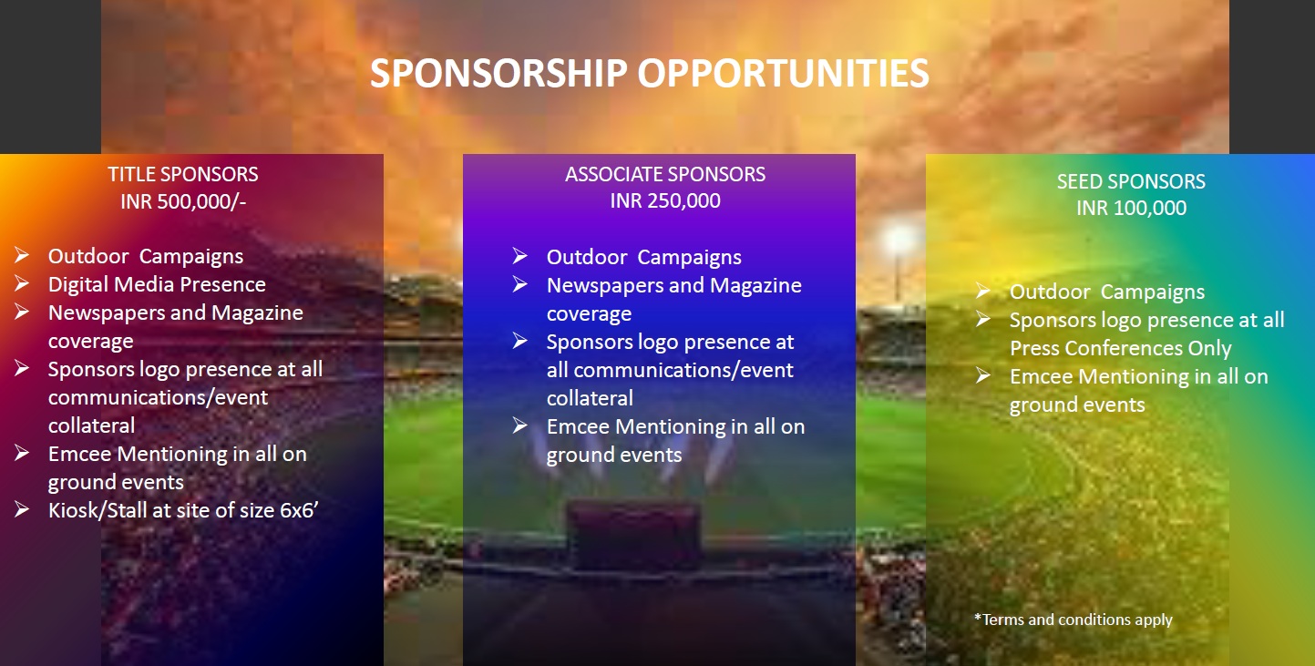 A) Medical and personal insurance B) Cost of all minor and major medical treatment during or after the tournament C) Cost of transportation and Travel Clothing and Equipment A) The tournament jersey would be provided by Citiskape Mediacom sports team to 15 players and 1 official of each team (Please do not wear jersey which has a corporate logo on it. B) Each team is responsible for the provision of its own team kit including Bat, Pad and gloves etc. Time and Format A) All teams are expected to reach the venue and report to umpires at-least 45 minutes prior to the match. B) All matches till the semifinals would be of 20 overs and final would also be of 20 overs. C) Citiskape Mediacom team would notify the captains for any kind of media conference or any such event for participation. * All logos used in the presentation are for representational purposes