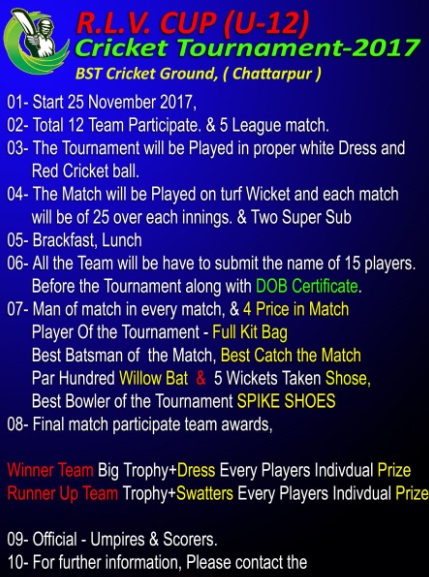 B S T Cricket Organization Chattarpur Presents :R.L.V. Cup U-12 Cricket Tournament 2017 Delhi From 25th November 2017 .