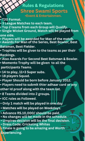 Shree Swami Sports Events Entertainment Organize “Under 12 Champions Trophy 2023” Started from 2 May 2023 with following facilities.